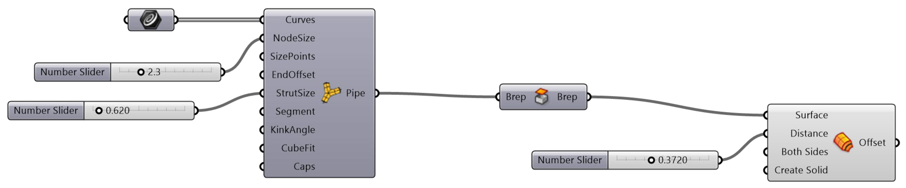 Figure 4 initiates with the definition of fundamental input parameters that guide the overall design process. These parameters, represented by nodes labeled “NUMBER”, control key attributes such as scale, dimensional proportions, and the quantity of repeated elements. For example, values such as NUMBER (1.0), NUMBER (10), and NUMBER (20) indicate base units, iteration counts, or specific dimensional controls within the system. These serve as dynamic input handles, allowing the designer to modify outputs interactively. Following this, geometric construction modules transform the numeric data into spatial components: “POINT” nodes generate coordinates based on input values, while “LINE” constructs linear connections between points. “PLANE” establishes spatial references for orientation and projection, and “EXTRUDE” generates volumetric forms by extending two-dimensional geometries along a specified direction. Together, these modules produce a flexible design structure that responds to parameter changes in real time. Data manipulation nodes such as “LIST ITEM”, “MERGE”, and “FLATTEN TREE” are also employed to efficiently organize, combine, and streamline datasets, which is essential when dealing with large quantities of geometric elements.