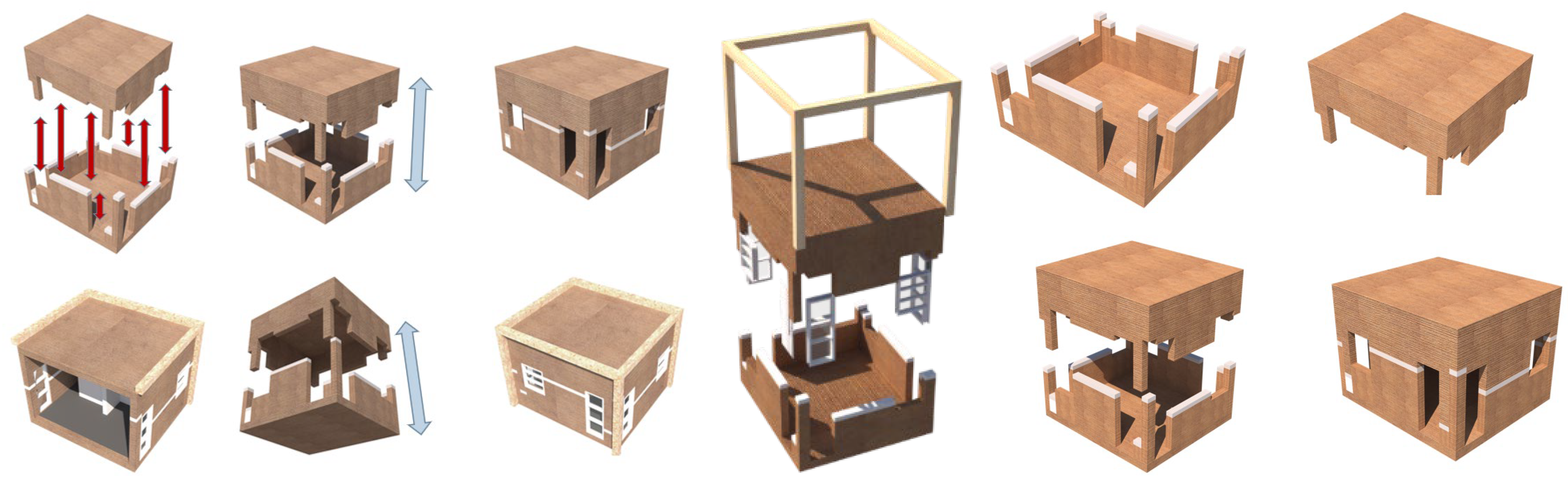 Figure 22, the prototype showcases a detailed building unit and demonstrates the structural system’s capacity for expansion, adapting to unit dimensions and occupant demand. This small-scale prototype significantly enhances the validity and accuracy of the proposed model, affirming its potential for highly flexible application in diverse locations, adaptable to specific local, social, and economic requirements. In post-disaster processes, the ability of users to rapidly prototype design modifications, visualize building components on-site, and evaluate them offers significant advantages. This approach not only enables the direct addressing of individual needs but also allows for the creation of housing unit prototypes through various three-dimensional printing technologies prior to actual construction. Rapid prototyping facilitates timely and effective responses to emergency shelter demands, while also enabling the development of adaptable and flexible solutions tailored to evolving conditions. Furthermore, the use of local materials during the prototyping phase allows for more efficient resource utilization and a reduction in logistical costs. In this context, enabling disaster-affected individuals to directly engage with prototypes and identify solutions suited to their specific needs emerges as a key element in fostering community participation.