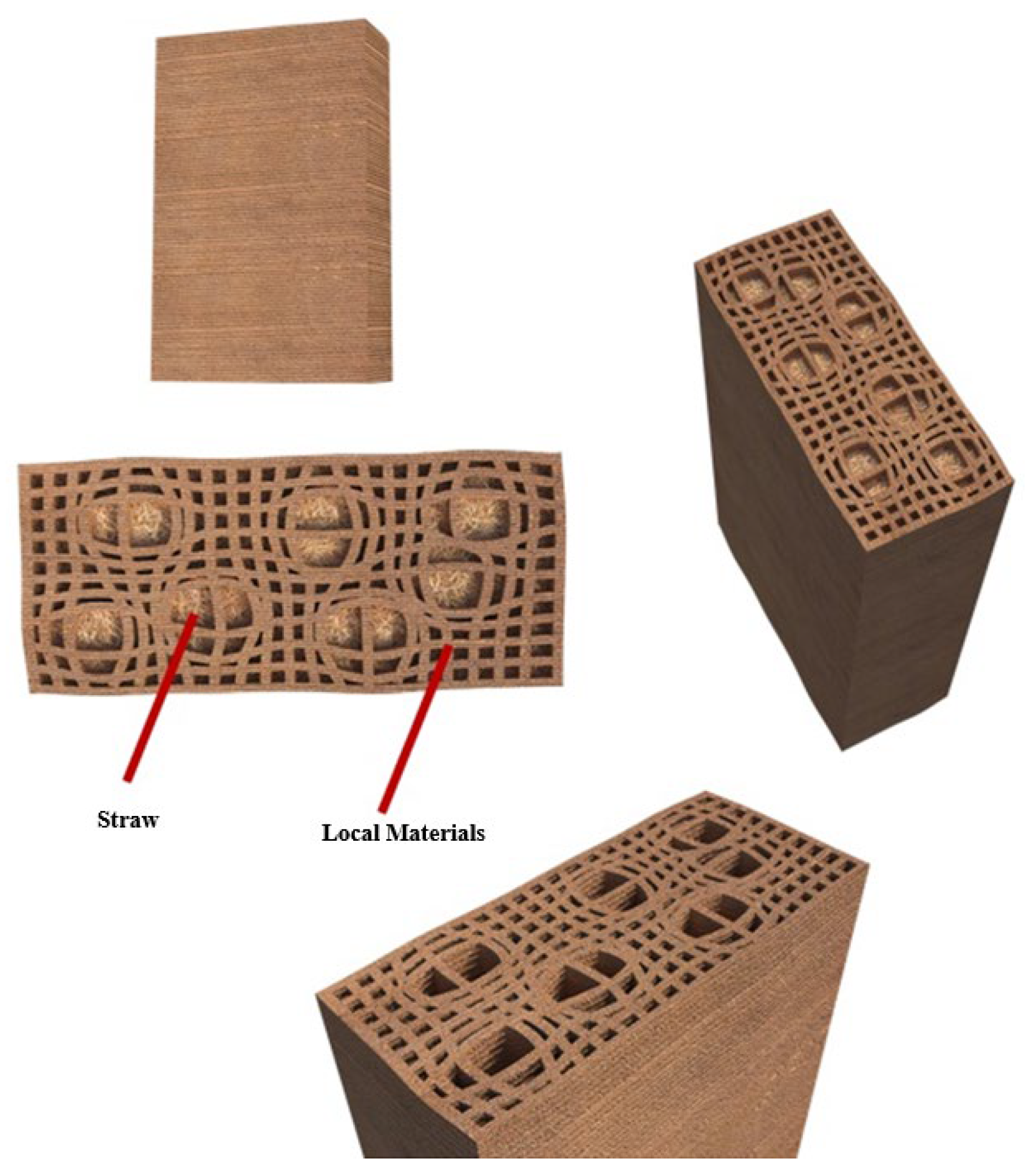 Figure 11. The use of local materials and straw in wall blocks offers significant economic and environmental advantages. Local materials enhance environmental harmony and reduce costs, while straw, due to its lightweight nature and high thermal insulation, facilitates transport and assembly. Internal voids within the blocks preserve structural strength, reduce weight, and improve thermal performance. The parametric algorithm optimizes the placement of these voids to maximize block efficiency.