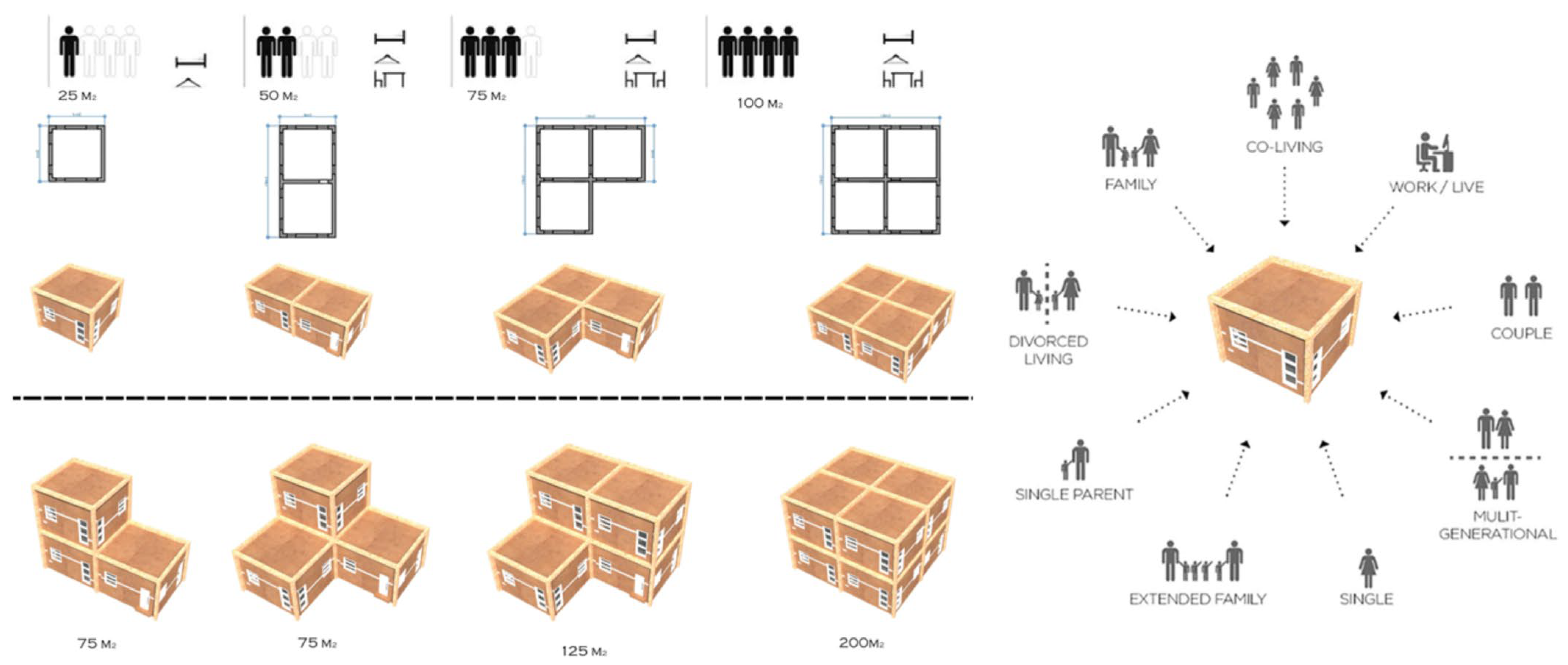 The proposed housing model leverages modular and expandable structural systems to create adaptable, comfortable, and sustainable living spaces that respond dynamically to evolving demographic and family structures. These systems are pivotal in modern housing design due to their capacity for rapid and effective adaptation to changing user requirements. Crucially, they also serve as highly efficient post-disaster housing solutions, enabling swift deployment of shelter in emergency contexts. The model incorporates distinct modular units to cater to varying household sizes: