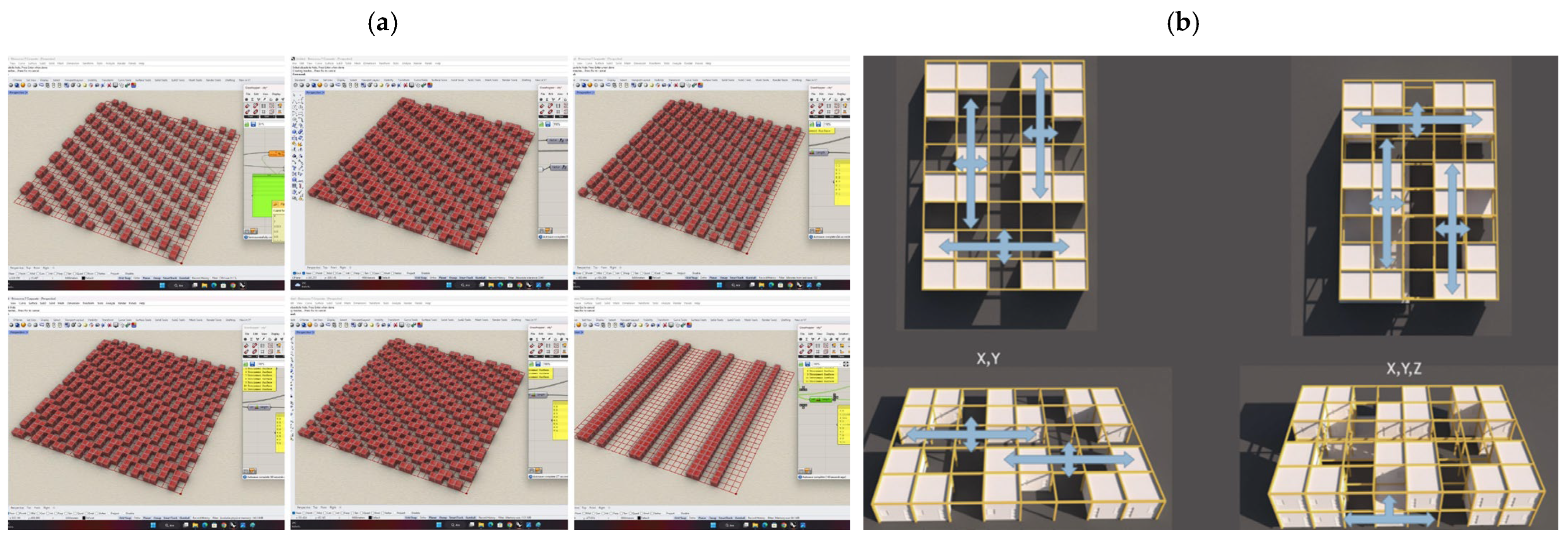 In the second phase, a parametric and modular system was developed using Grasshopper, a visual programming plugin for Rhino 3D version 7. The spatial system was based on a standardized 5 × 5 m modular grid, chosen for its scalability and spatial efficiency. The design process involved the following stages: