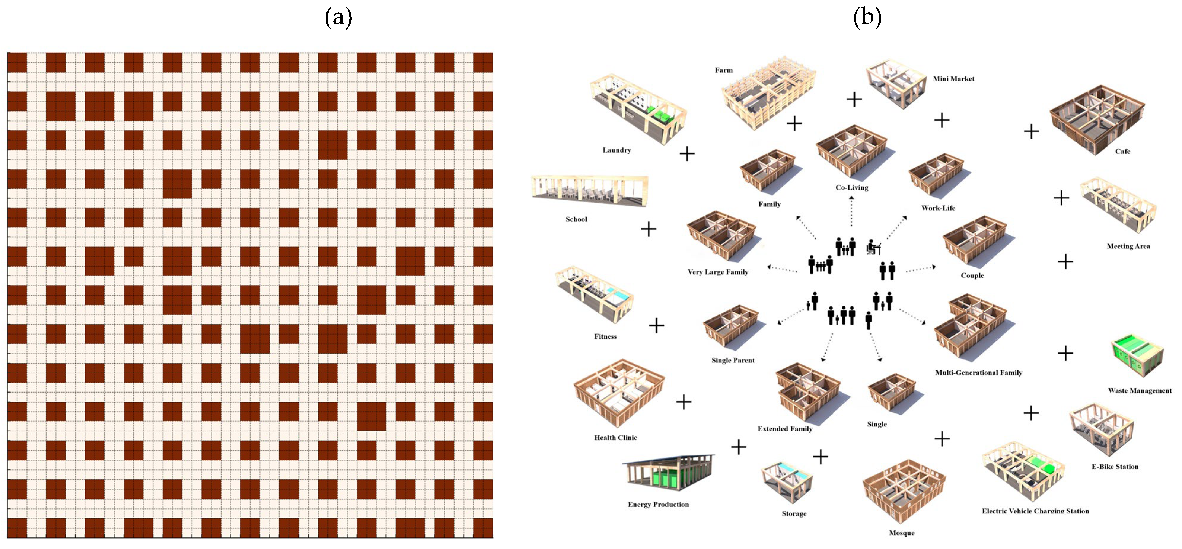 Figure 15 also showcases various community-oriented buildings, including farms, mini-markets, cafés, meeting spaces, laundries, schools, health clinics, waste management facilities, energy generation centers, storage units, mosques, electric vehicle charging stations, and fitness centers. This visual representation is directly derived from the algorithm detailed in