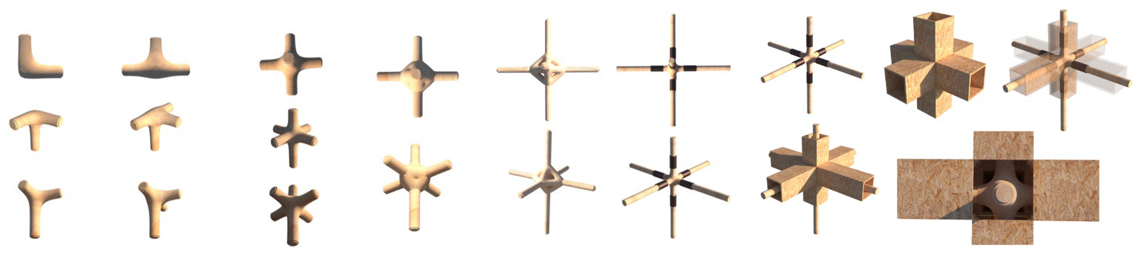 Figure 19 showcases a series of algorithmically generated connection components, engineered for diverse angular and orientational linkages. Fabricated from wood using CNC carving techniques, these components are precisely machined to ensure robust and accurate interconnections. The underlying algorithm, detailed in
