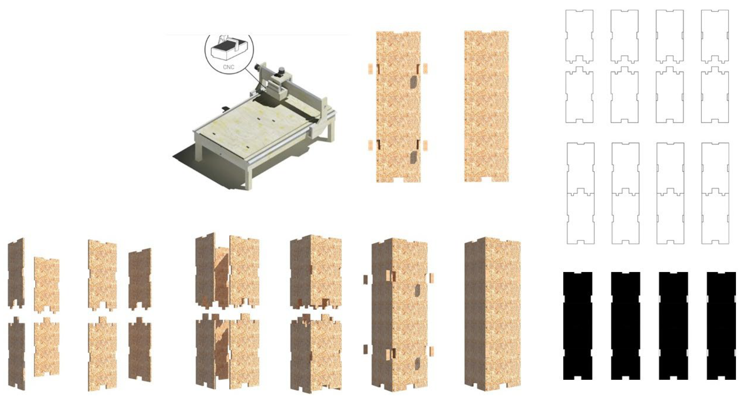 In the proposed model, the structural components consist of CNC-carved connectors and OSB-based panels.