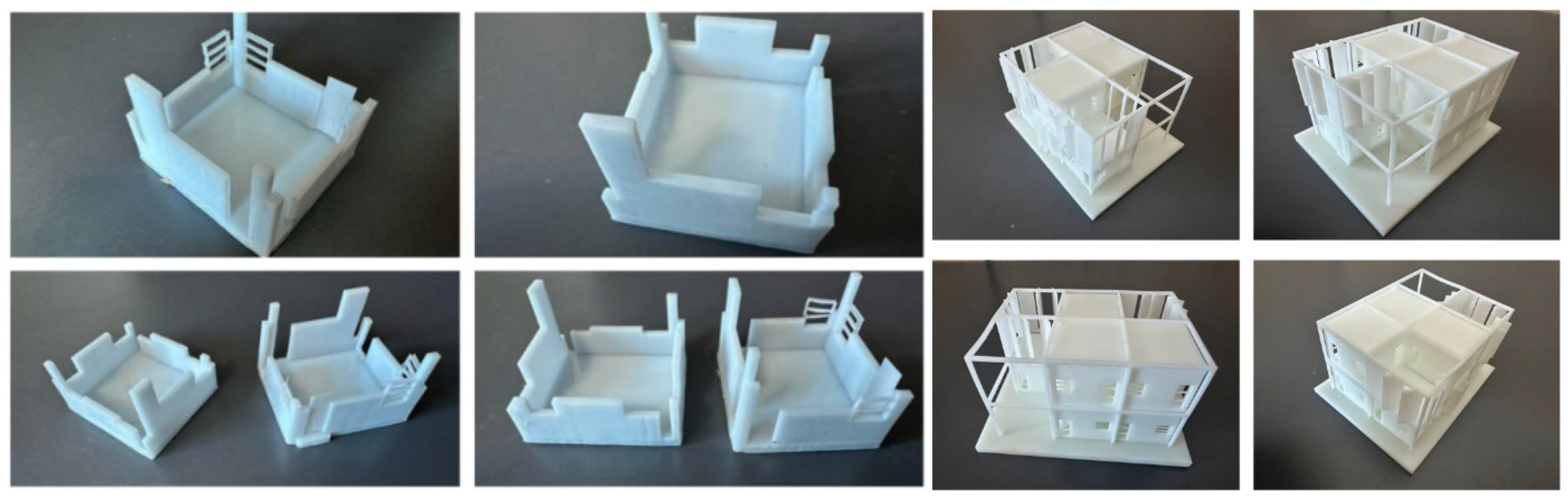 While it is acknowledged that the stereolithography (SLA) method employs resin-based materials that differ significantly from adobe in terms of mechanical and thermal performance, the purpose of the prototype presented in this study was not to replicate material behavior, but rather to validate the geometrical logic, assembly principles, and spatial modularity of the proposed system. SLA was selected specifically for its high-resolution capabilities, which are essential for examining the architectural articulation of interlocking components, joint tolerances, and potential spatial configurations in a compact and precise format.