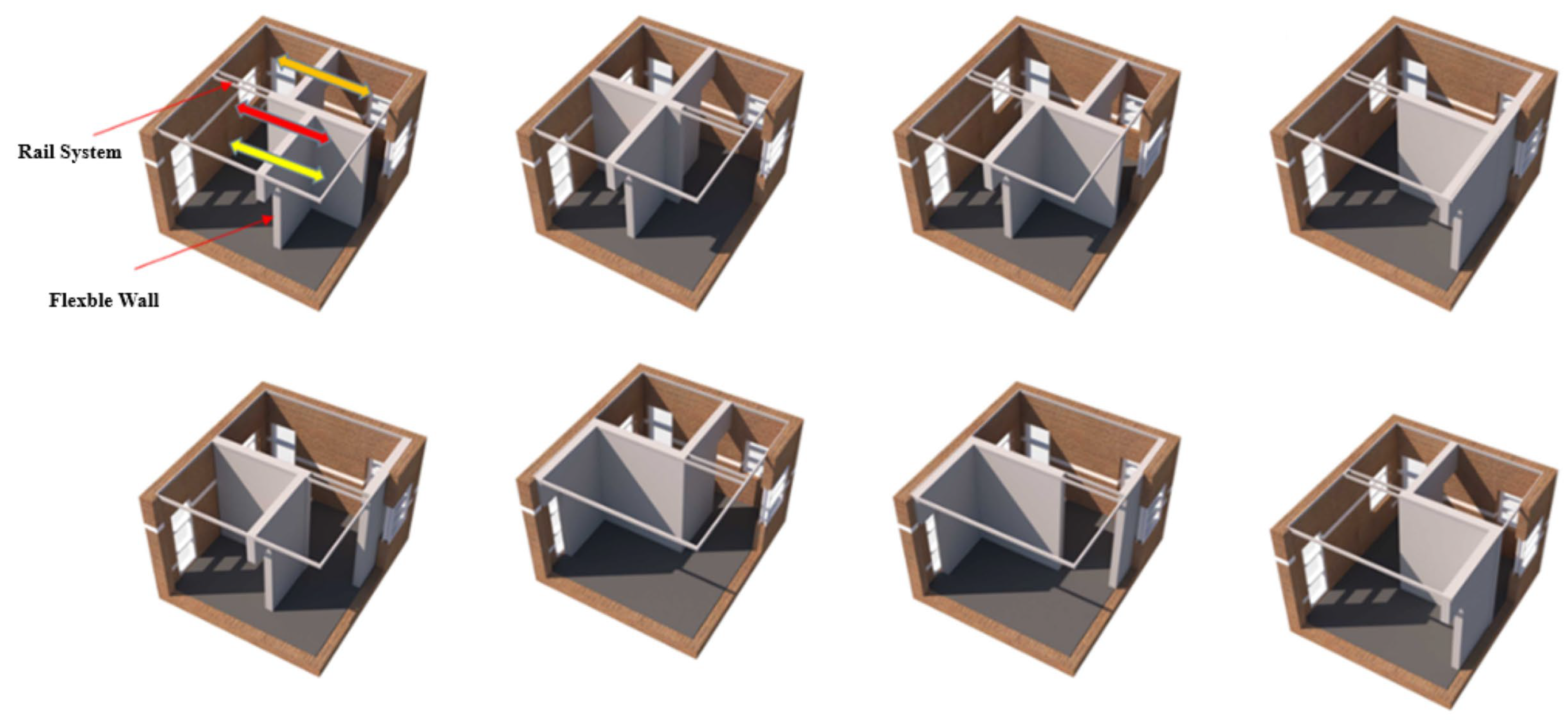 Flexible interiors are defined as spaces that can respond to varying user needs, adapt to environmental changes, and be easily reconfigured. In this respect, this section discusses different types of flexibility in interior layouts and presents practical applications of these approaches. Additionally, it focuses on how flexible interior design can be optimized through the proposed model. Using flexible partition walls and a rail system, the model allows for rapid and efficient spatial reconfiguration based on user needs. The model presents eight different configurations demonstrating the spatial diversity provided by the flexible internal walls and rail system. Each configuration illustrates how the space can be adapted to varying user requirements. Flexible walls can easily slide along the rail system, allowing the internal layout to be modified. This enables spatial arrangements to be rapidly reconfigured in response to changing needs.