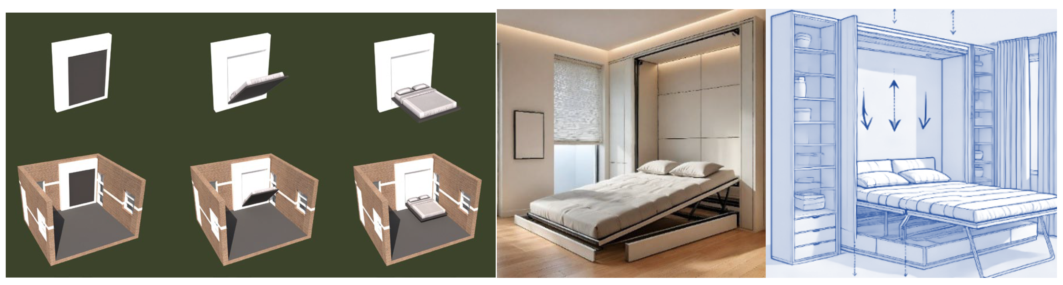 Figure 24 illustrates a foldable bed system that exemplifies a highly adaptable furniture solution, offering significant utility in diverse living environments, particularly within post-disaster housing. This design facilitates the multifunctional use of interior spaces, allowing areas to seamlessly transition between different programmatic functions, for instance, a living room during daylight hours can be readily converted into a sleeping area at night. Such a system provides a rapid and practical response to evolving accommodation needs in emergency or transitional housing scenarios. Its wall-integrated design is crucial for optimizing space utilization, enabling occupants to leverage their living environments with enhanced efficiency. As detailed in the materials and methods section concerning interior features, this adaptable wall system represents a key approach to achieving enhanced spatial flexibility and promoting the multifunctional use of limited interior volumes.