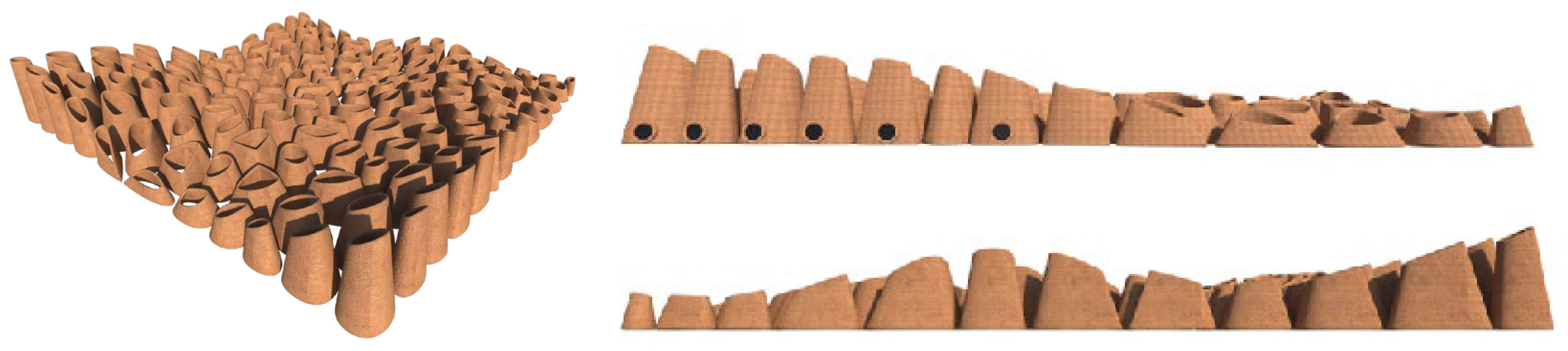Furthermore, the design can be customized based on, for example, climate and user needs, developing solutions that enhance ventilation in hot climates and improve insulation in cold regions. The dimensions and forms of the blocks can be adapted to local standards and cultural values, meeting both functional and esthetic requirements. Lightweight blocks increase portability and enable rapid assembly. This approach supports sustainability through local material usage, while the flexibility of parametric design ensures the versatility and esthetic value of the structures.