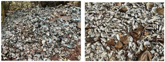 The eastern regions of Thailand, such as Chonburi, Rayong, Chanthaburi, and Trat, are coastal areas where many residents engage in seafood harvesting and processing. These places are also notable tourist sites, drawing a large number of visitors from all over the globe, resulting in a substantial demand for seafood. Shellfish is highly sought after for its delectable flavor and exceptional nutritional advantages. Mussel is a highly popular shellfish due to its widespread availability and versatility in culinary preparations. This gives rise to the issue of accumulated mussel shell waste. Presently, the disposal of trash generated by the seafood industry, particularly mussel shells, presents a substantial obstacle (Figure 1). After consuming the meat, an estimated 5 million tons of shells are discarded annually, mostly through landfill, which is improper as it causes soil and water pollution, reduces soil porosity and fertility, and impedes water absorption [8,9]. Shells require a maximum of 10 years to undergo decomposition and are not biodegradable. Moreover, the expense associated with appropriately disposing of shell trash is substantial. Local restaurant owners and shell processors stated in interviews that trash disposal often entails burying the shells. Disused shells are frequently abandoned in residential or public spaces to undergo natural decomposition, leading to olfactory pollution, causing disruptions in communities, and serving as breeding sites for disease-causing microorganisms, which could potentially affect public health. Nevertheless, because of the irregular nature of this gathering, the trash gradually builds up, resulting in unpleasant smells and problems with air pollution. In addition, the decomposition of shell debris in acidic settings results in the release of carbon dioxide, which has a substantial impact on global warming [10,11].