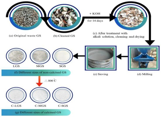 The primary focus of most shellfish-based research is the investigation of the conversion of CaCO3 to CaO through the process of fire at various temperatures. The study focused on investigating the thermal decomposition of CaCO3 and analyzing the relationship between temperature and other factors, including lattice constants, thermal expansion coefficients, lattice strain, and crystallite size. The primary method for pre-treating seashells to obtain CaO is rinsing the shells with tap water. Subsequently, acetone or mild acids were employed to eliminate organic substances from the shell. Hence, certain chemicals used in manufacturing processes may have an impact on the environment. Subsequently, the shell was subjected to boiling for a duration of 30–60 min or followed by heating for 1–4 h at 105–120 °C and finally pulverized to obtain CaCO3 powder [14,17,20]. Once CaCO3 is acquired, the conventional approach to handling CaCO3 entails subjecting it to CaO use in high-temperature incineration prior to its utilization in other goods or small-scale industries [14,21,22]. This process necessitates the use of kilns and entails substantial energy and time consumption, yielding shell powder consisting of minute CaO particles. Consequently, it is not feasible for the local community to manage vast quantities of discarded shells independently [21,22,23,24,25].