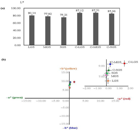 Color values of different-sized non-calcined and calcined GMSs: (a) L* and (b) a*b* diagram, with enlarged areas shown above for better visibility. L* indicates lightness (higher = brighter); a* indicates red (+) to green (−); b* indicates yellow (+) to blue (−). Dot colors represent sample types: orange = LGS, pink = MGS, light green = SGS, red = C-LGS, blue = C-MGS, dark green = C-SGS.