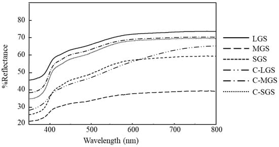 Figure 4 presents the reflection spectra of the samples. The calcined crushed shells of SGS and MGS exhibit a higher reflection percentage compared to the non-calcined crushed shells. The reflectance of calcined crushed shells (C-SGS) is 1.2 times more than that of non-calcined crushed shells, while the reflectance of calcined mixed grain shells (C-MGS) is 1.8 times greater. Computation was performed using the percent reflectance value at a wavelength of 550 nm. The observed outcomes could potentially be attributed to the increased surface area of calcined crushed shells, resulting in enhanced light scattering. However, LGS has the highest reflectance due to its strong angular reflection, as mentioned by reference Lertvachirapaiboon [28]. Such an effect ultimately results in a higher overall reflection value.
