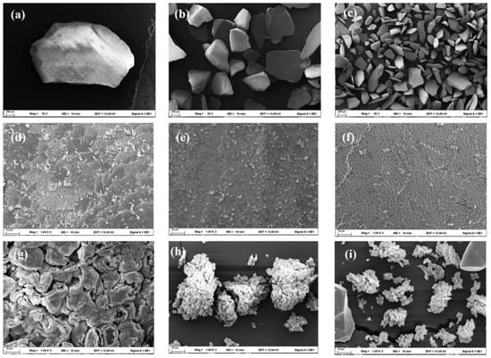 SEM images of ground shell powder: (a–c) particle size comparison of LGS, MGS, and SGS (200 μm scale); (d–f) surface textures of uncalcined powder (10 μm scale); (g–i) morphological changes after calcination showing particle agglomeration (10 μm scale).