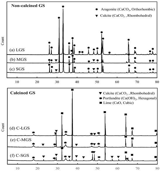 The XRD spectrum of LGS, as shown in Figure 6a, unequivocally demonstrates the presence of the aragonite polymorph with a purity of 100%. Figure 6b,c displays the XRD spectra of MGS and SGS, respectively. The experimental results indicate that the shells, which vary in size from moderate to small, consist of a combination of calcite and aragonite polymorphs of CaCO3. This occurrence can be attributed to the thermal energy generated during the grinding and erosion of the shell during processing, resulting in the creation of small amounts of different crystal forms of calcite within the CaCO3 structure. Figure 6d–f displays the X-ray diffraction spectra of the calcined powder from all three shell sizes at a temperature of 800 °C. Figure 6d illustrates the results of the LGS after undergoing the most thorough calcination process. The presence of lime (CaO) appears to exist, whereas only a small quantity of CaCO3 in the form of calcite is present. In addition, the presence of portlandite (Ca(OH)2) is indicated at trace levels, which are less than 1%. The X-ray diffraction (XRD) patterns of medium- and small-sized shells after calcination, as shown in Figure 6e,f, reveal higher concentrations of CaO and Ca(OH)2 compared to the larger shells. The difference can be attributed to the larger surface area of smaller broken shells, which enables them to efficiently release heat energy and decompose at a faster rate [34,35]. Furthermore, if an atmosphere with oxidizing properties is present during the calcination process, there is an increased likelihood of CaO, carbon dioxide, or water undergoing a reaction, leading to a greater production of Ca(OH)2 in comparison to larger shells.