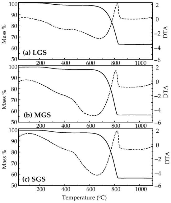 TG-DTA diagrams illustrate various GMS sizes. (a) LGS; (b) MGS; and (c) SGS.