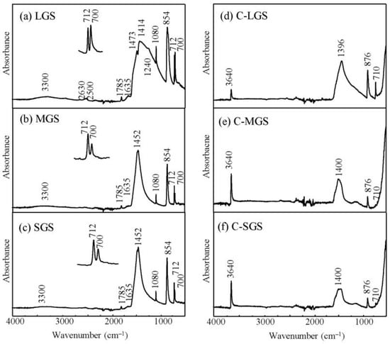 FTIR spectra of different-sized non-calcined and calcined GMSs: (a) LGS; (b) MGS; (c) SGS; (d) C-LGS; (e) C-MGS; and (f) C-SGS.