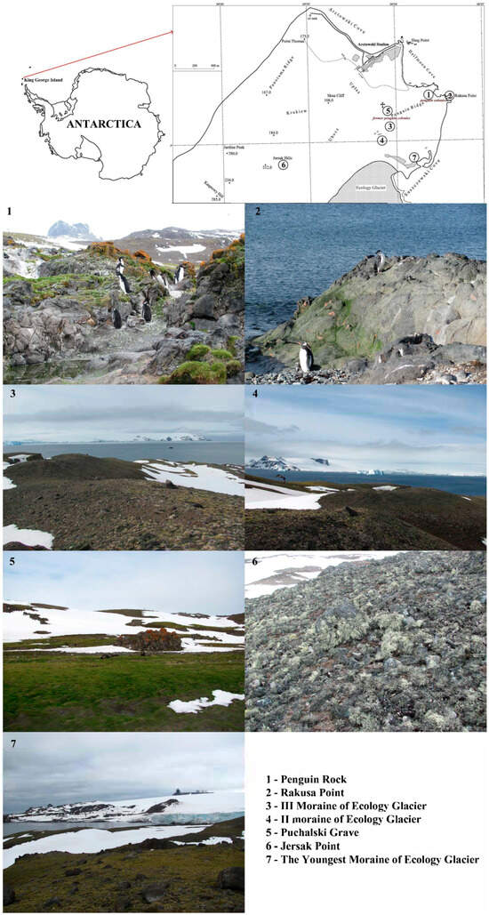 A general description of the investigated sites is presented in Figure 1 and Table 1. Sites 1 and 2 are basalt rock outcrops, affected by the fertile waters flowing from the penguin area (site 1) or located in the immediate vicinity of an Adélie penguin (Pygoscelis adeliae) rookery (site 2). Flowering plants grow there abundantly, but only on the side of the penguins’ migration routes. Sites 3 and 5 are sloping edges of relatively old fluted moraines and a former penguin rookery [55], hence the relict influence of bird species Pygoscelis adeliae, P. antarctica and P. papua, Larus dominicanus, as well as pinniped mammals (Pinnipedia). Currently, skuas are nesting at site 5. Other investigated sites have not been influenced by birds—sites 4 and 6 are basalt rock outcrops, moraines, and hills, and site 7 is located on the youngest fluted moraine with rich petrographic composition and the most minimal plant cover among the sites.