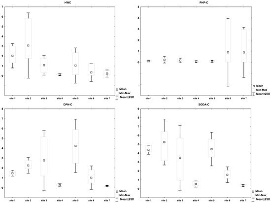 The amounts of DPH-C and SODA-C were correlated with each other (Figure 3) and with TOC (Table 3). Their amounts are also depicted in the values of HD, which were the lowest in Regosols at site 7 (<10%) and the highest at sites 3 and 5 (Table 2). Generally, all HD values were low, and the coefficient of variation for HD was low (Table 2). The ratio of L/S did not exceed 1.0 but was the highest in Regosols (site 7) and Leptosols (sites 1 and 2), suggesting ongoing microbial processes in SOM. It was also high at site 3, but lower than at sites 1, 2, and 7. The lowest values of L/S were recorded for sites devoid of bird activity—4 and 6 (Table 2).