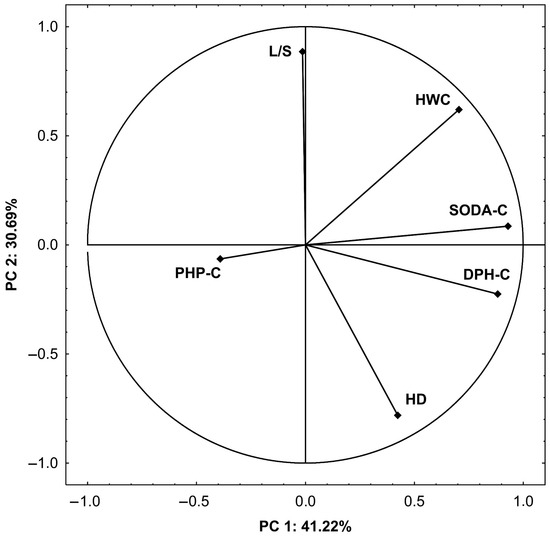 In order to describe the state of humification, three humus fractions, varying in their association with the cations present in the soil, were extracted using the method described by Dabin [54]. Three extraction solvents were used—2 mol dm−3 phosphoric acid (H3PO4), used to extract unbound organic carbon compounds (PHP-C), 0.1 mol dm−3 sodium diphosphate (Na4P2O7) at pH 9.8, used to extract humus compounds bound to cations (DPH-C), and 0.1 mol dm−3 sodium hydroxide (NaOH), used to extract humus compounds that form larger associations or those with higher molecular weight, and also associated with cations (SODA-C). Briefly, five grams of air-dried soil were mixed with 25 mL of an H3PO4 solution, agitated for 30 min with a back-and-forth shaker, and centrifuged for 5 min at 1500× g. The supernatant was then filtered through a flat filter. The undecomposed and fresh plant parts were filtered out and excluded from the study, whereas the filtrate contained PHP-C. The remaining soil was mixed with 50 mL of sodium diphosphate, left in contact overnight (agitating several times), centrifuged for 30 min at 3000× g, and filtered. A similar extraction sequence was performed with NaOH. Before every extraction, the soil was washed with inorganic water by agitating for 15 min, centrifuging, and filtering the washing water. The part of the organic matter not soluble in any phosphoric acid, sodium diphosphate, or sodium hydroxide was called the residuum. The carbon in the examined fractions was measured in a TOC analyzer (Analytik Jena Multi N/C 3100).