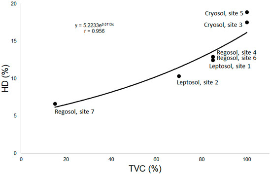 The relation between total vegetation cover (TVC) and humification degree (HD).