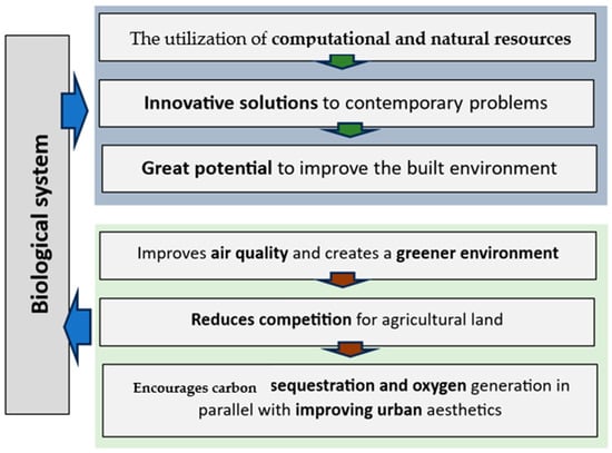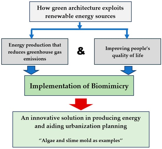 Green architecture encompasses a multifaceted and holistic array of design and construction methodologies, encompassing both passive and active strategies aimed at minimizing energy consumption through the optimization of building orientation, insulation, and ventilation systems; conserving finite natural resources through the strategic selection of sustainably sourced and low-impact building materials; promoting ecological integrity through habitat preservation, restoration, and the integration of green infrastructure; and enhancing occupant well-being through the creation of healthy, productive, and biophilic indoor environments [14,15,16]. By aligning architectural design principles with the overarching objectives of sustainable development, green architecture offers a tangible and scalable pathway toward the creation of built environments that are not only environmentally benign but also socially equitable and economically viable, thereby contributing to the realization of a resilient, regenerative, and sustainable future for generations to come. Green architecture consistently looks for new and inventive ways to cut down on carbon dioxide (CO2) emissions from the energy buildings use, both when they are being built and throughout their lifespan. This often involves combining renewable energy sources, smart passive design techniques, and eco-friendly materials. One exciting area of inspiration is biomimicry, where we learn from nature, like how algae and slime molds handle energy and even urban planning, as shown in Figure 2. These nature-inspired ideas provide fresh avenues for making buildings much more energy-efficient and sustainable. By analyzing these concepts, we can better understand their potential to create urban environments that are both energy-efficient and environmentally friendly.