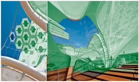 The advent of organic photovoltaics (OPVs) is fundamentally reshaping the application of renewable energy sources (RESs) within architectural design. This transformative potential was vividly illustrated by the German Pavilion’s Solar Trees, a hallmark feature showcasing OPV modules, as shown in Figure 3. These five imposing, twelve-meter-high structures not only serve as a striking visual motif but also underscore the pavilion’s broader emphasis on cutting-edge technologies and the prudent utilization of resources and space. OPVs distinguish themselves as flexible photovoltaic cells that harness organic compounds for both light absorption and charge transference. Their inherent pliability affords an expansive spectrum of architectural applications for such solar systems. Furthermore, the manufacturing methodologies for polymer OPV cells are comparatively straightforward, hinting at their potential for widespread, cost-effective deployment in the future. This particular photovoltaic technology is categorized as third-generation, succeeding silicon-based cells (Generation I) and thin-film cells (Generation II). Beyond their profound symbolic resonance, the Solar Trees command attention as a futuristic and dominant element within the German Pavilion, simultaneously providing visitors with welcome shade and serving as a highly efficient system for generating sustainable energy. Further examples of integrating PV cells into pavilions are mentioned in [39].