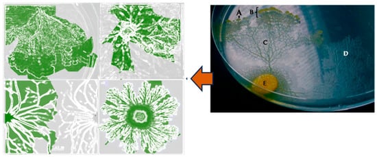 Example of a plasmodium network. On the right: (A) pseudopodia, (B) search lead, (C) tubular structure, (D) extracellular slime, and (E) food source, left side zoom in for plasmodium network [93].