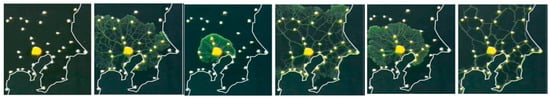 Establishment of the plasmodium network. It started from the large yellow spot, representing Tokyo, with the white dots representing nearby cities [93].
