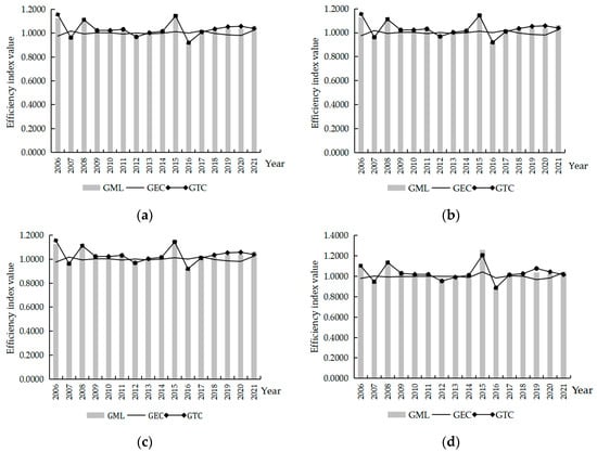- From the measurement results, the GLCUECL in the HREEB exhibits a general upward trend throughout the study period. However, disparities persist in efficiency levels, exhibiting a trend of “ESLA > MIRA > HREEB > NHEZ”, though the efficiency gap is gradually decreasing. The growth in the GML index for the entire HREEB and its three sub-regions is driven by both technological progress (GTC) and changes in efficiency (GEC), with GTC being the primary driving force behind the improvement.