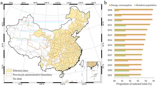 Study area and its energy and population profiles: (a) Administrative divisions and geographic coordinates of the study area; (b) The proportion of energy consumption and resident population of the sample cities relative to the national totals.