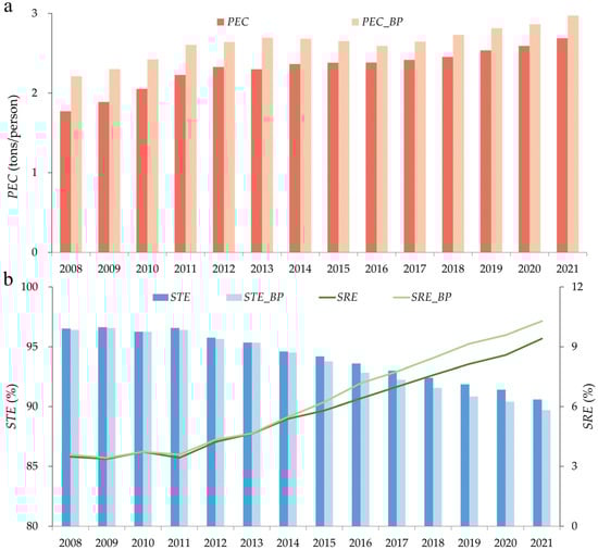 In the process of regional reconstruction triggered by urban shrinkage, per capita energy indicators possess strong identificatory power, as they reveal the structural risks inherent in individual loads. In this study, per capita energy consumption (PEC) is defined as the representative variable for UEC, a strategy that not only retains the informational foundation of urban energy utilization but also incorporates the real mapping of population dynamics on the energy system’s pressure. Additionally, PEC has been widely used in studies on regional energy performance evaluation, energy accessibility analysis, and sustainability boundary determination [34,35], further enhancing its practical relevance as a core variable in this paper. A comprehensive review of existing sources confirms the lack of official long-panel data on urban energy consumption in China. Therefore, aggregated and disaggregated energy consumption data are derived from national and provincial energy balance tables in the China Energy Statistical Yearbook, combined with sectoral value-added and resident population to construct weighted factors, employing a top-down proportional scaling method [36]. This study references BP’s Statistical Review of World Energy to validate the accuracy of the indicator data [37]. Comparative analysis of city-level aggregates reveals that the generated data on PEC, as well as STE and renewable energy (SRE), exhibit similar trends and relatively small absolute deviations compared to BP’s reported figures (Figure 2). Furthermore, given the strong correlation between traditional energy consumption and CO2 emissions, we calculated the bivariate correlation coefficients between total energy consumption and city-level CO2 emissions reported by the China Emission Accounts and Datasets [38]. The annual correlation coefficients were all statistically significant at the 1% level, ranging from 0.661 to 0.814. Collectively, these results affirm the high consistency of the constructed urban energy consumption dataset with existing records.