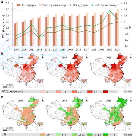 Spatiotemporal characteristics of UEC and urban shrinkage: (a) Annual trends of UEC and urban shrinkage; (b) Spatial distribution patterns of UEC; (c) Spatial distribution patterns of urban shrinkage.
