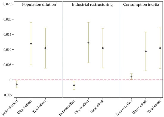 Considering the latent risk of effect bias in identifying mechanism paths with stepwise regression [49], this study further introduces the Bootstrap resampling technique to identify the direct, indirect, and total effects of urban shrinkage on UEC under each pathway (Figure 4). The results show that the confidence intervals for the indirect effects corresponding to the three pathways do not include the zero-reference line, indicating that the population dilution, industrial restructuring, and consumption inertia pathways are statistically significant and form important transmission channels for the impact of urban shrinkage on UEC.