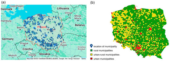 Municipalities in Poland that participated in this study: (a) municipalities shown in relation to neighboring European countries and (b) municipalities in Poland classified as urban, urban–rural, or rural in all 16 voivodeships (administrative borders of each voivodship are marked on the map).