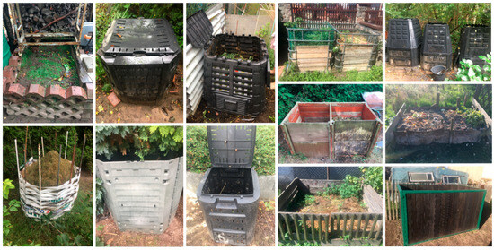 To ensure comprehensive and consistent data collection, the direct measurements of the amount of municipal BHrecycled in each household were taken for 7 consecutive days each month over a period of 12 months. Thus, these measurements included all four seasons (winter, spring, summer, and fall) during a complete calendar year. Examples of the composting units used by the participating households are presented in Figure 2.
