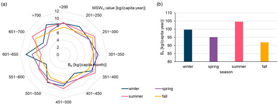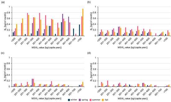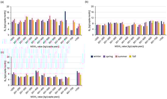 The average mass of BK differed somewhat depending on the MSWG value and the season (Figure 4). Although the differences were statistically unclear (p > 0.05), Figure 4 shows that BK values observed in summer were slightly higher than in other seasons, particularly for the MSWG values between 201 and 400 kg/(capita·year). This could be related to an increase in the consumption of fresh produce, e.g., vegetables or fruits, and an increase in waste from spoilt food in the warmer months. In contrast, the lowest composting values occurred in winter for household MSWG values above 500 kg/(capita·year). The average seasonal values were 99.70, 95.14, 104.62, and 91.86 kg/(capita·year) in winter, spring, summer, and fall, respectively.