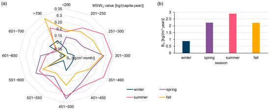 The average mass of BG separated and composted at the source from the households kg/(m2·month) grouped based on the MSWG value of the municipality where the household was located depending on the season (a) and the average seasonal mass of BG (b).
