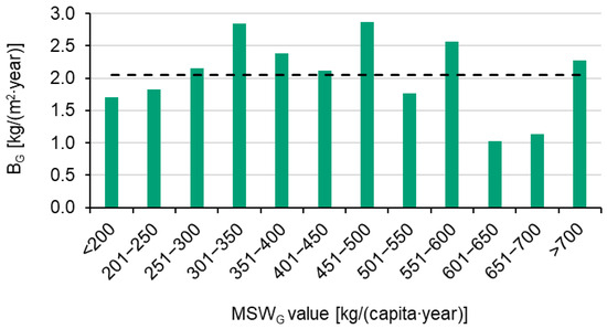 The average annual masses of BG from the households were grouped based on the MSWG value of the municipality where the household was located; however, the statistical analyses indicated that there was no clear relationship between the MSWG value and BG (Figure 8). The average annual masses of BG remained within a range across the MSWG value, from 1.02 to 2.87 kg/(m2·year) (Figure 5). The lack of a clear trend in the annual mass of BG versus the MSWG value suggested that the MSWG value did not have a large impact on the mass of BG. Whilst one might expect the relationship between the amount of BG and the higher total waste generation to be associated with greater quantities of biowaste, this relationship is not evident here. The average annual mass of BG generated and recycled at source per square meter of green space in the household (only those households with declared green areas and composting of BG) in Poland was ca. 2 kg.