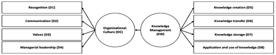 The results for the model of causal relationships. The figure shows the values obtained using the SMARPLS software. OC—organizational culture; D1Recogni—recognition; D2Communic—communication; D3Values—institutional values; D4Leadership—executive leadership; KM—knowledge management: D5Knowl_Crea—knowledge creation; D6Knowl_Transf—knowledge transfer; D7Knowl_Stora—knowledge storage; D8Knowl_Appluse—knowledge application and use. Source: own preparation.