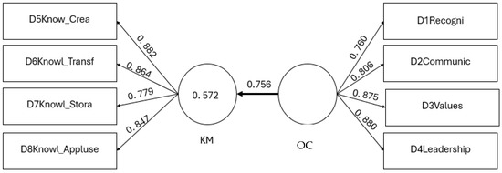 Likewise, our discriminant validity analysis using the Fornell–Larcker criterion established that the OC construct has the highest correlation (Table 7). These results confirm that each construct shares more variance with its own indicators than with those of the other constructs, ensuring that OC and KM are conceptually distinct in the model.