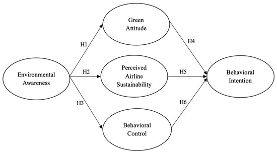 This research adopts the Theory of Planned Behavior (TPB) [38,39] as its foundational framework because of its widely recognized robustness in explaining pro-environmental behaviors. While the TPB traditionally includes attitude, subjective norms, and perceived behavioral control, this study extends it by incorporating “Awareness” as a critical antecedent based on existing research suggesting that knowledge and awareness significantly influence attitudes and perceptions related to sustainability [40,41]. The model hypothesizes that “Awareness” positively impacts these sub-constructs, which in turn shape behavioral intentions, emphasizing the importance of fostering an internal “Green Mindset” to promote sustainable travel behaviors among passengers. Specifically, the six hypotheses were developed by considering the following logic:
