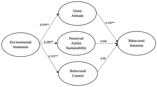The results of the direct path analyses are presented in Table 5. The findings indicate that environmental awareness significantly influences green attitude (H1), perceived airline sustainability (H2), and behavioral control (H3), and that green attitude significantly affects behavioral intention (H4). However, the effects of perceived airline sustainability (H5) and behavioral control (H6) on behavioral intention were not statistically significant.