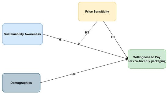 The theoretical framework of this research is derived from theory in behavioral economics and decision models of consumers (Figure 1). It argues that consumers’ willingness to pay (WTP) for green packaging will largely depend on two psychological-economic factors: sustainability awareness and price sensitivity. Sustainability awareness is the cognitive and affective predisposition of the consumer towards environmental concerns [51]. It encompasses knowledge, concern, and perceived significance of sustainability, more so concerning packaging and consumer products. While price sensitivity expresses the extent to which price variation impacts a consumer’s buying habit [52], it is anticipated to have a negative effect on WTP, serving as a constraint or trade-off during decision-making. Besides the direct effects, the proposed framework includes a moderation effect, wherein it is hypothesized that price sensitivity will reduce the positive effect of awareness of sustainability on WTP. This implies that environmentally conscious but price-aware consumers might not always put their money where their mouth is [53,54]. Last but not least, demographic variables of income, education, gender, and age are added as control variables, as they tend to influence awareness and WTP in significant ways.