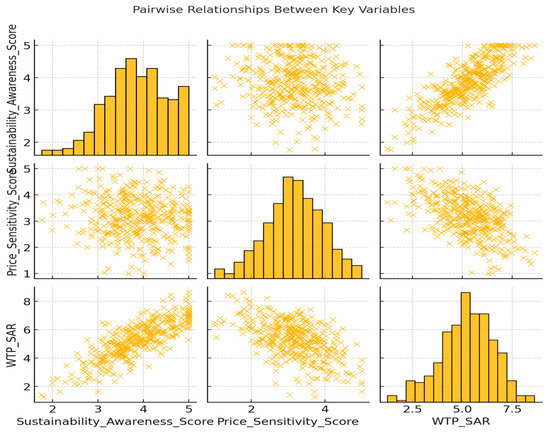 The analysis (Figure 3) showed that awareness of sustainability had a statistically significant and strong positive effect on WTP, having a regression coefficient of +1.4114 (p < 0.001). It shows that as there was one unit increase in sustainability awareness, the willingness of the consumer to pay was increased by approximately 1.20 SAR. The findings suggest that people who are more environmentally aware and attitudinally closer to sustainability values tend to adopt more pro-environmental consumption behavior. On the contrary, price sensitivity had a statistically significant negative correlation with WTP, whereby the coefficient was −1.0006 (p < 0.001). This indicates that highly price-concerned consumers tend not to pay a premium price when it comes to environmentally friendly alternatives. That is, even though they may be concerned about the environment, highly price-conscious consumers might care more about money than the environment.