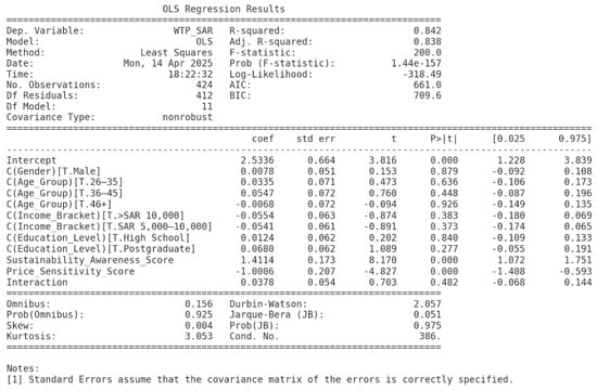To investigate the determinants of consumer willingness to pay (WTP) for environmentally friendly packaging, a multiple linear regression framework was applied. WTP was the dependent variable, and the primary independent variables were sustainability awareness, price sensitivity, and their interaction term, in addition to demographic controls of age group, gender, income, and education level. This enabled the estimation of the direct, interaction, and background effects on the consumer’s reported price premium simultaneously.