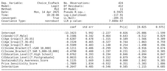 In order to examine consumer behavior further in a decision-making context, a binary logistic regression analysis was conducted. The dependent variable was defined so that it measured discrete choice behavior, whereby the respondents were assigned a value of either 1 or 0, dependent upon the respondent’s willingness to pay (WTP) category being at or above, or below, 5 SAR, respectively. This cutoff was selected so that it defined a realistic decision boundary that differentiated consumers who were willing to pay a worthwhile premium for green packaging and those who were not. The analysis included the same set of variables as the OLS regression: sustainability awareness, price sensitivity, their interaction term, and the demographic controls of primary interest (Figure 4).
