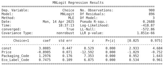 In order to capture the trade-off processes consumers use to balance product-level attributes in actual buying situations, a Discrete Choice Model (DCM) framework was implemented under a Multinomial Logit (MNL) model (Figure 5). Respondents were shown three choice sets, each including three fictional options that differed along three attributes: price, type of package (eco-friendly or plastic), and content of the environmental label (“100% recyclable,” “biodegradable,” or “non-recyclable”). This design permitted the estimation of marginal utilities driven by specific sustainability indicators, mimicking how customers in a multi-option competitive retail setting would behave.
