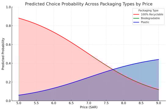 In contrast, the use of environmentally friendly packaging had a highly significant and positive effect on consumer choice (β = +1.297, p < 0.001). This shows a distinct consumer preference for environmentally responsible material compared to traditional plastic, irrespective of other product characteristics (Figure 6). Likewise, both eco-labels had a highly significant increase in the likelihood of being selected, even though the degree of preference was not the same. Products bearing the “biodegradable” label experienced a rise in the likelihood of choice (β = +0.747, p < 0.001), whereas products bearing the “100% recyclable” label experienced the strongest positive effect. This indicates that certain wording in environmental communication can really play a role in affecting consumer perception and choice. Saudi consumers’ preference of “100% recyclable” above “biodegradable” might, of course, stem from more familiarity, trust, or confidence in recycling terminology.