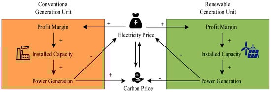 The interaction between the electricity market and the carbon trading market is fundamentally driven by electricity prices and carbon trading prices, as illustrated in Figure 1. When electricity demand rises, electricity prices increase, boosting the profit margins of both conventional and renewable generators. However, conventional units—such as coal-fired plants—must purchase carbon allowances proportional to their generation, which drives up carbon demand and carbon prices. As carbon prices climb, the profitability of conventional generators declines due to the additional carbon cost, which discourages capacity expansion and reduces their output, and thereby alleviates carbon demand. In contrast, renewable generators—unaffected by carbon costs—benefit from higher electricity prices and expand their capacity more rapidly. As the share of renewables in the generation mix grows, their zero-marginal-cost output exerts downward pressure on electricity prices. Meanwhile, the displacement of carbon-intensive conventional units by renewables reduces the overall carbon demand, which in turn suppresses carbon prices. Over time, these interactions lead the system to a dynamic equilibrium between electricity and carbon markets.