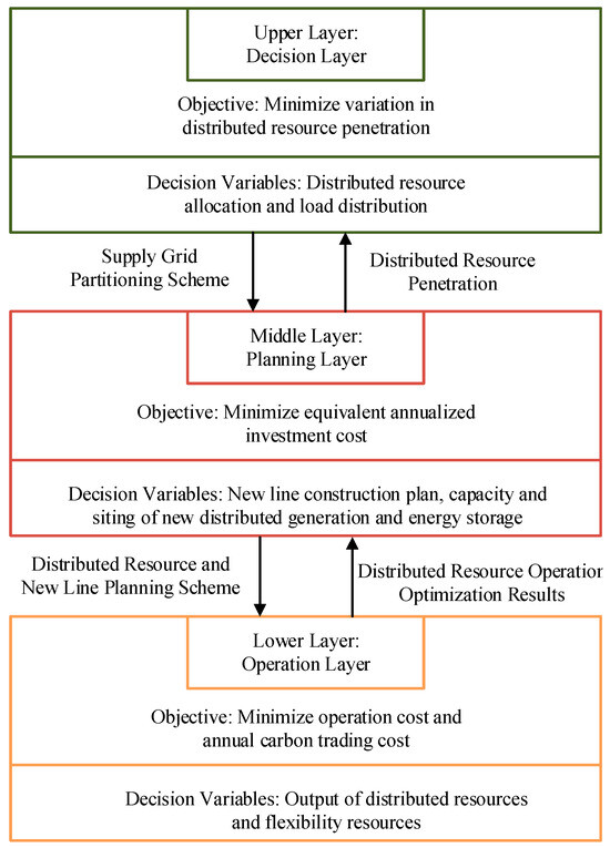 This study establishes a three-layer planning framework consisting of the decision, planning, and operation layers. The decision layer aims to minimize the variation in distributed resource penetration rates, with renewable energy capacity allocation, installation locations, and load distribution being decision variables, while partitioning the network into supply grids. The planning layer minimizes the equivalent annualized total cost (including annualized investment cost, annual operation cost, and annual carbon trading cost) by determining new line construction plans and the capacity and siting of newly added wind turbines, PV units, gas turbines, and ESS. The operation layer optimizes the sum of the operational costs and annual carbon trading costs based on the decisions from the planning layer. These three layers are interconnected through their objective functions and mutually influence one another. The model structure is illustrated in Figure 2.